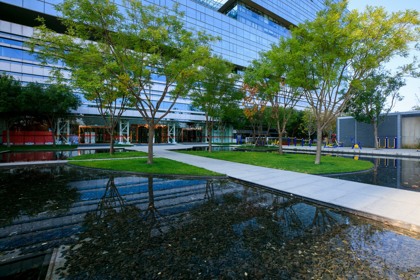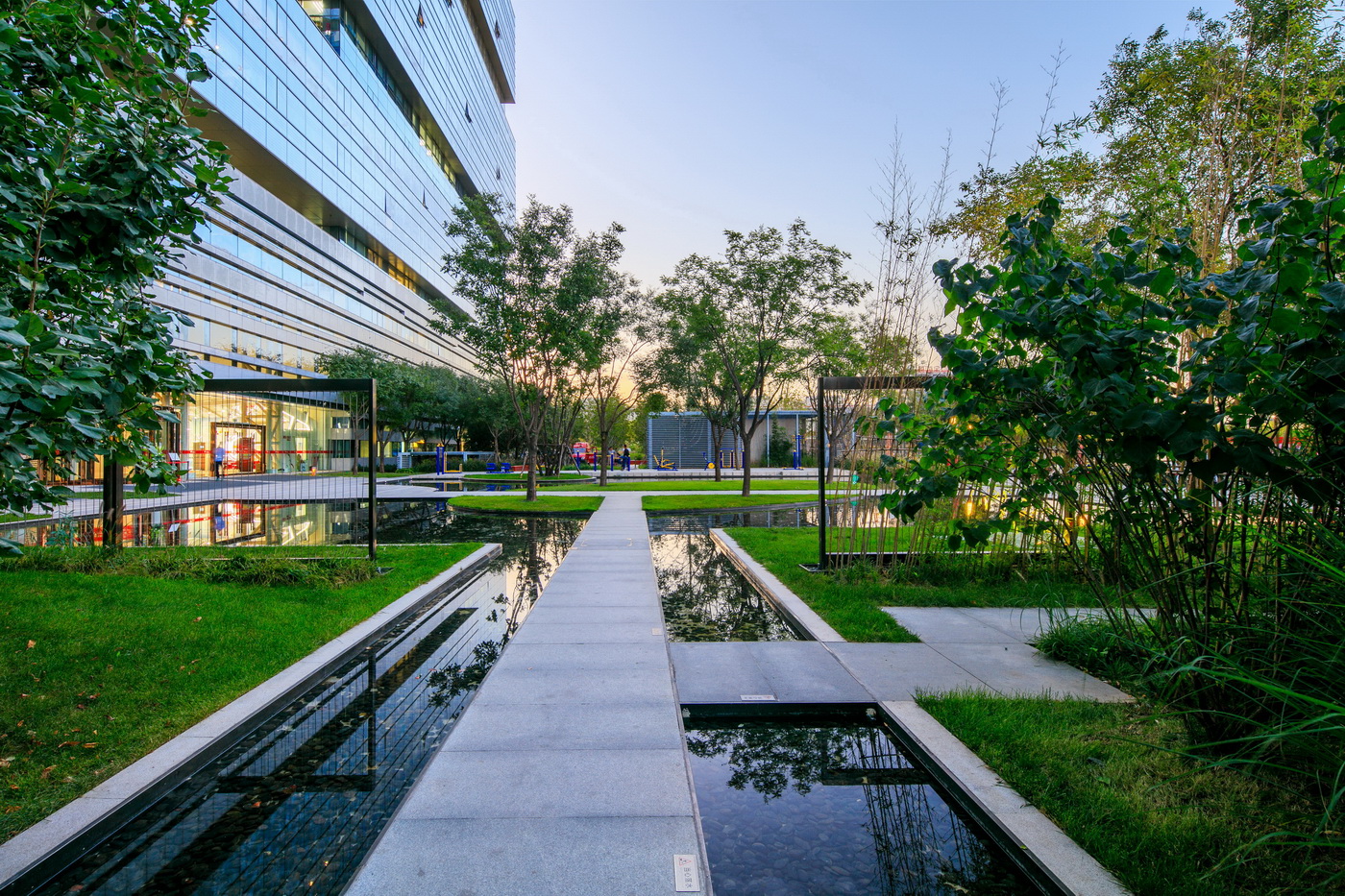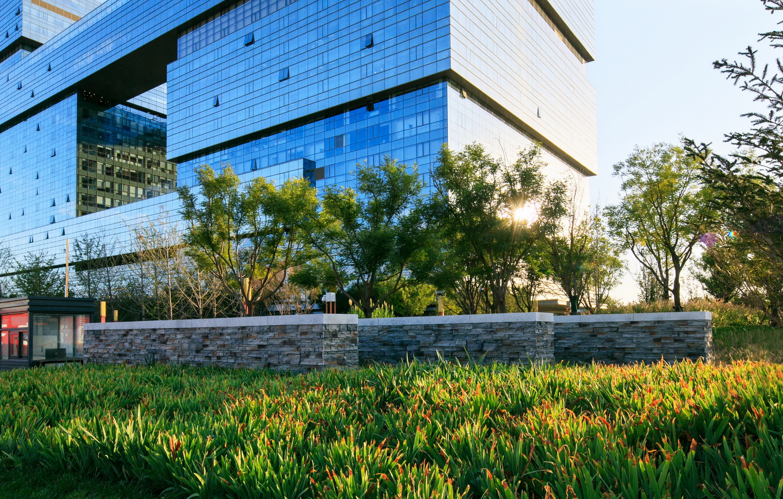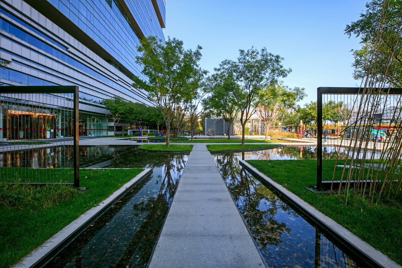 北京京東集團總部為京東集團總部辦公樓,項目應用野草、整石等營造野趣又簡約大氣的辦公空間。項目工程采用了新工藝—不銹鋼鋼絲影壁,其邊框為碳化拉絲不銹鋼。影壁施工中多次與設計甲方溝通,實地做樣板,為了更好的營造景觀,最后將原來的亞克力板改為不銹鋼鋼絲繩。以片植竹子為背景的影壁在陽光或燈光照射下效果極富意境。在辦公人員休息活動區(qū)域,具有項目特色的紅菠蘿格木椅,點綴飄逸的觀賞草,既是休息之處亦是觀賞之景,充滿意趣。