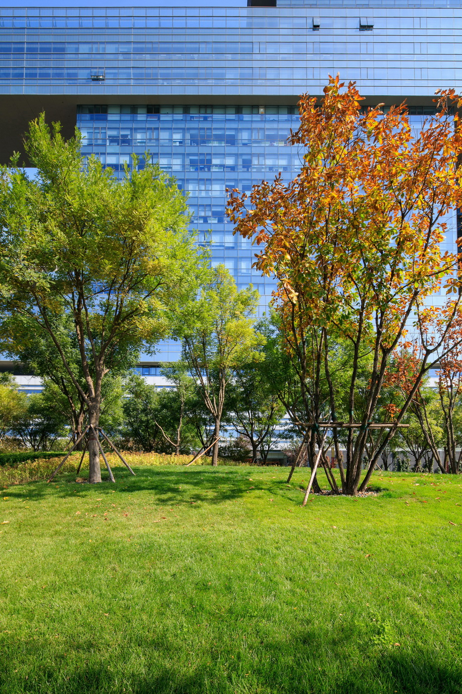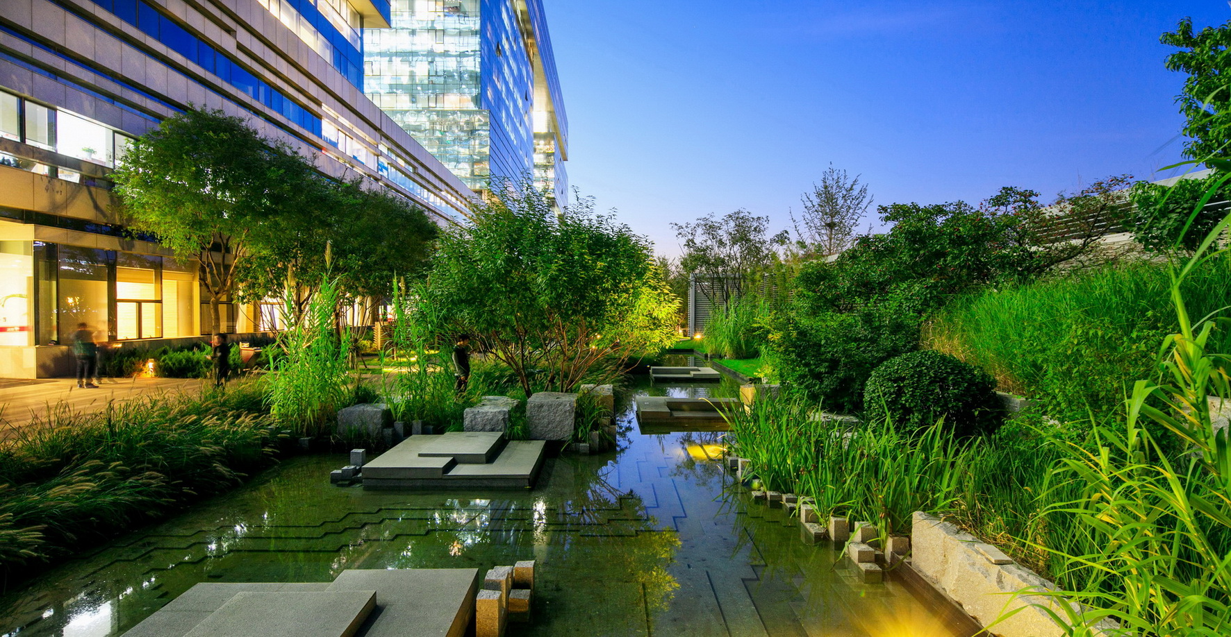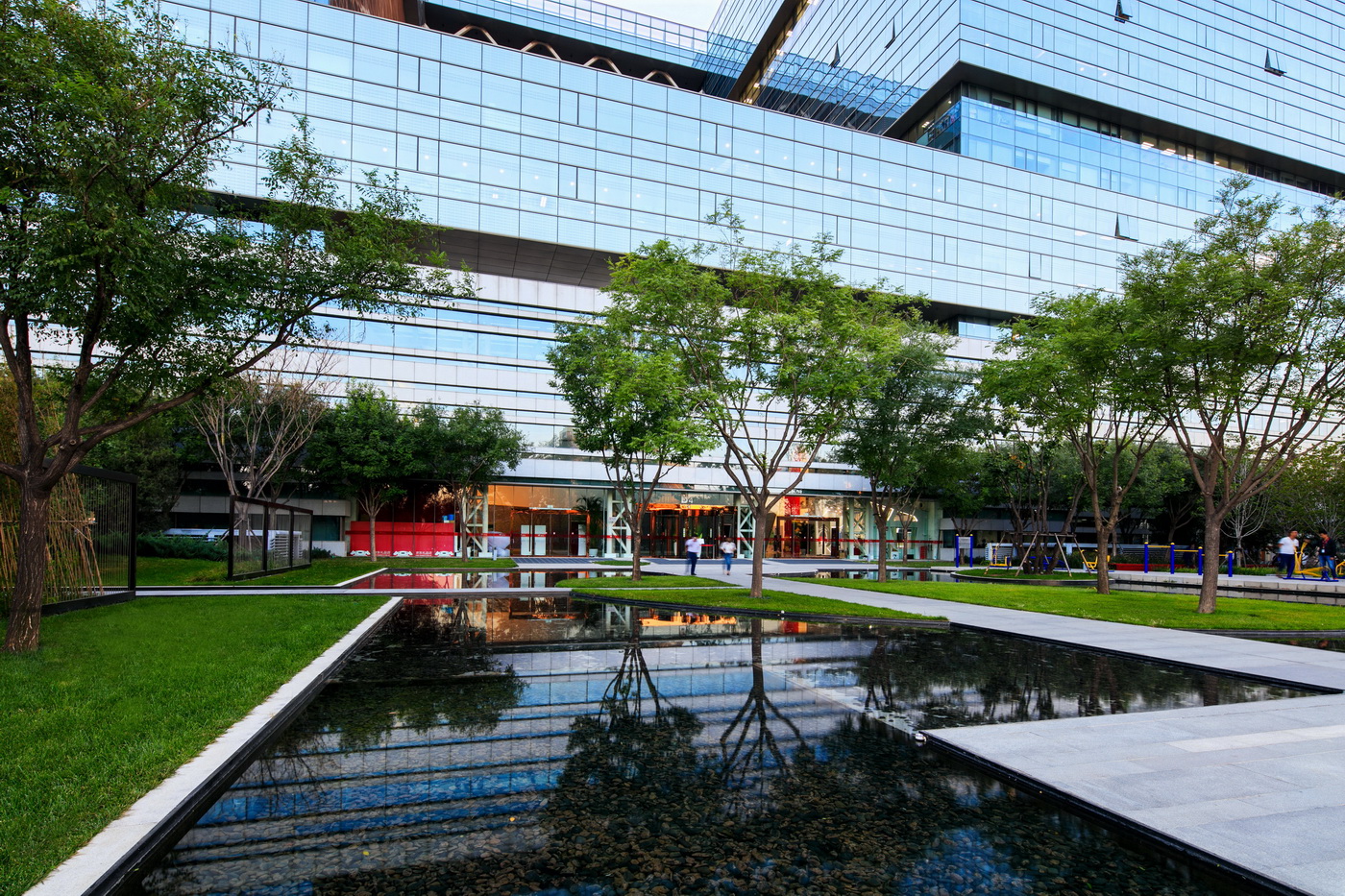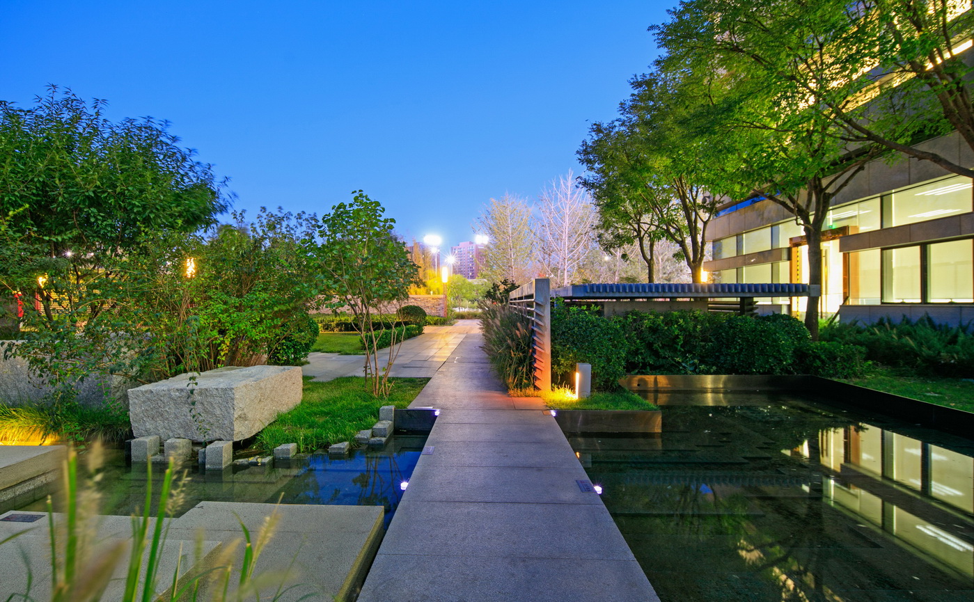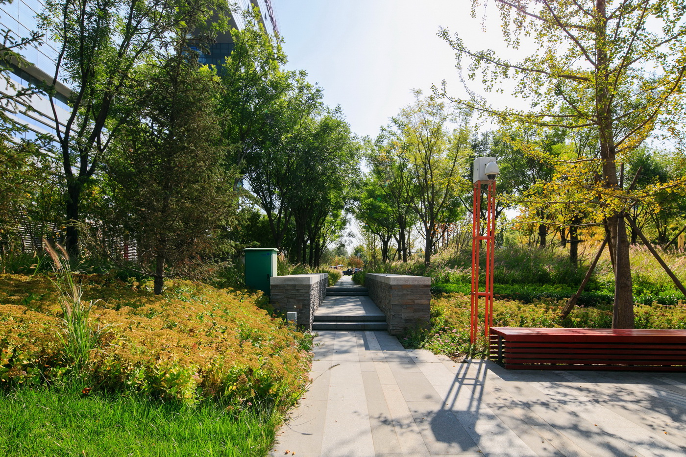 北京京東集團總部為京東集團總部辦公樓,項目應用野草、整石等營造野趣又簡約大氣的辦公空間。項目工程采用了新工藝—不銹鋼鋼絲影壁,其邊框為碳化拉絲不銹鋼。影壁施工中多次與設計甲方溝通,實地做樣板,為了更好的營造景觀,最后將原來的亞克力板改為不銹鋼鋼絲繩。以片植竹子為背景的影壁在陽光或燈光照射下效果極富意境。在辦公人員休息活動區(qū)域,具有項目特色的紅菠蘿格木椅,點綴飄逸的觀賞草,既是休息之處亦是觀賞之景,充滿意趣。