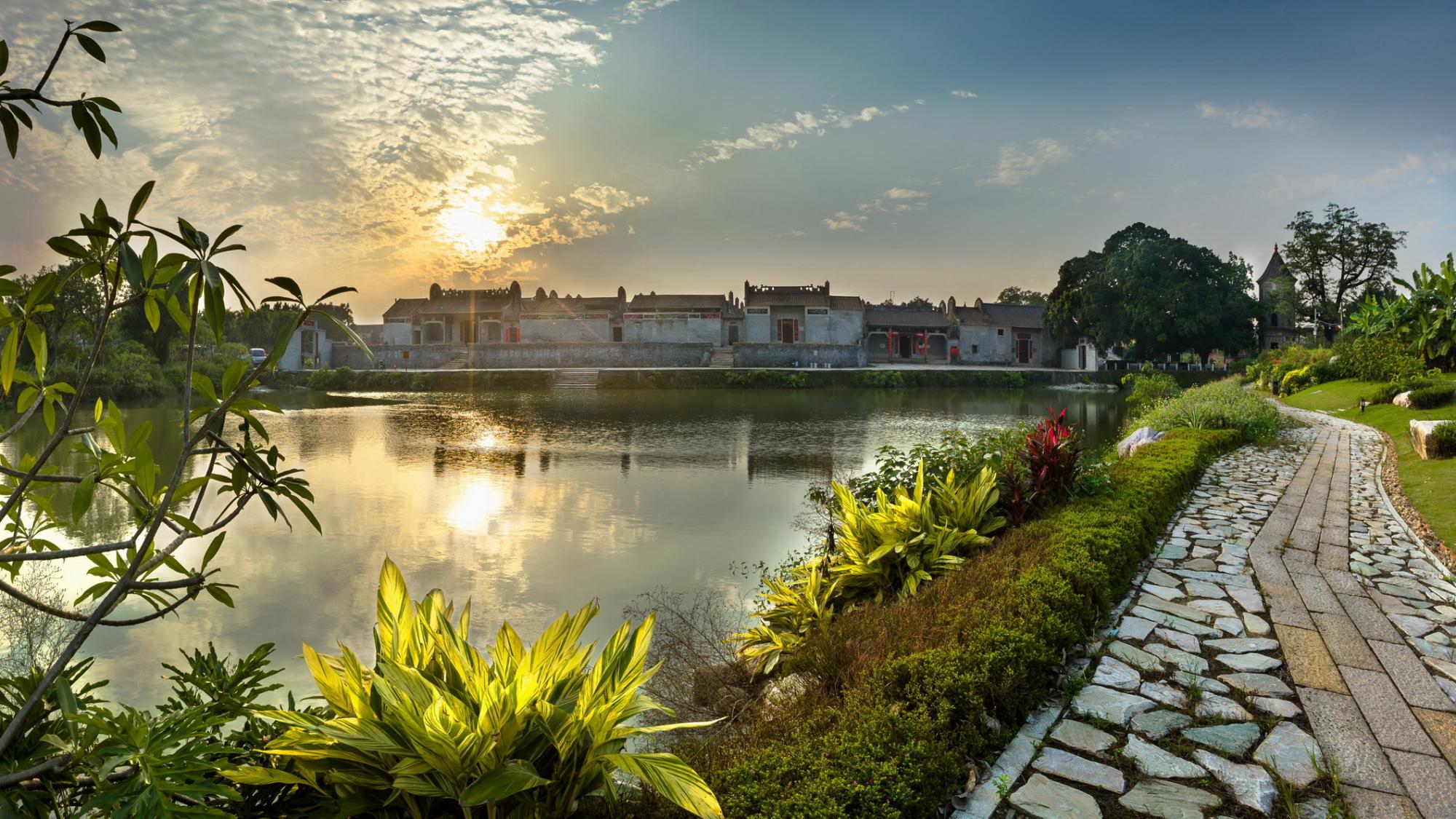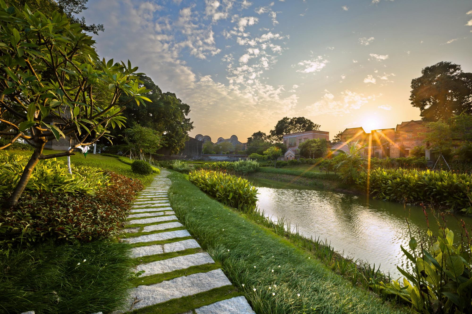 大旗頭古村是佛山市三水區(qū)樂平鎮(zhèn)“一河一路一基地”的重點工程。該村被評為“廣東第一村”,古建筑群是清朝著名水師提督——鄭紹忠所建居所。在充分尊重原有場地,最大保留的原則下,進行優(yōu)化、美化、生態(tài)化。以歷史文化傳承,惠及民生為前提,力求打造樂平鎮(zhèn),乃至佛山市的一張新名片。工程施工圍繞一個“古”字做文章,要求做新如舊,景墻飾面的舊青磚,地面鋪裝的舊石板,形態(tài)各異的太湖石,古色古韻,似古猶存。溪中景石擺放形態(tài)自然,配以水生植物,野趣橫生??芍^一磚一瓦,一草一木與周邊環(huán)境協(xié)調一致,相得益彰,宛自天成。