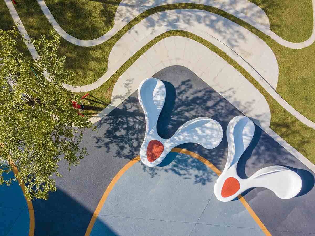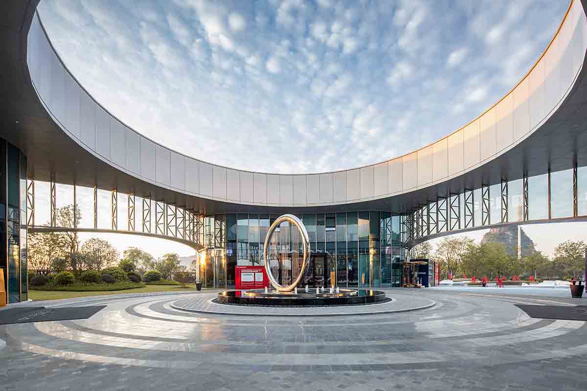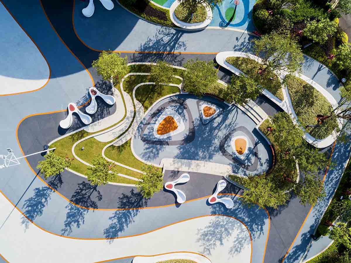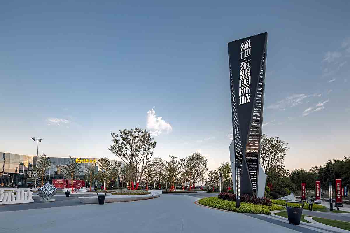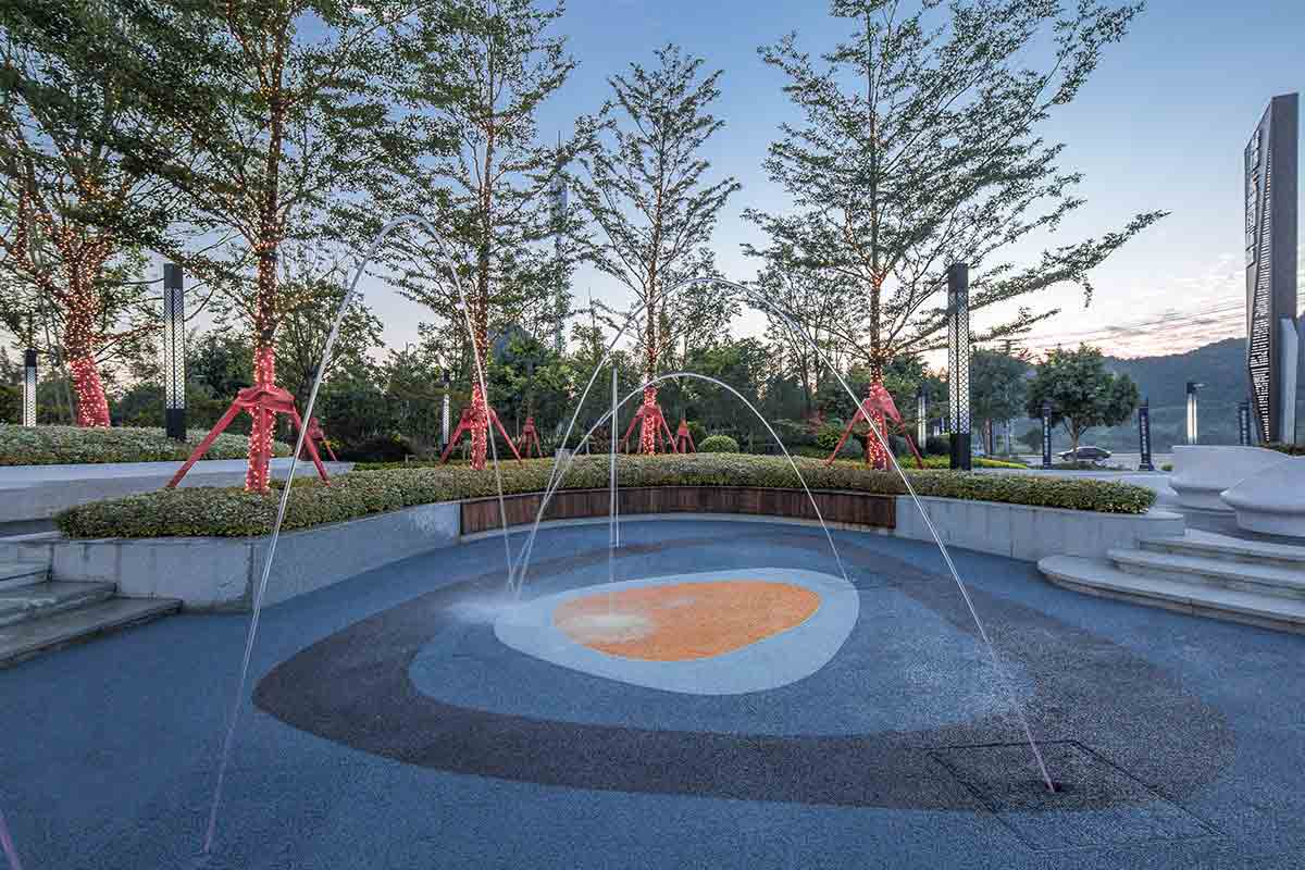 東盟國(guó)際城位于優(yōu)美的里建湖群。景觀設(shè)計(jì)從場(chǎng)地地脈入手,將“水”引入其中,通過(guò)提取自然界中湖泊的特征元素,將其景觀化處理并融入空間。項(xiàng)目從平面藝術(shù)的構(gòu)圖出發(fā),仿造水紋動(dòng)感流線之形,大量運(yùn)用曲線元素,打造園區(qū)整體性鋪裝。結(jié)合光帶打造出“行云流水”的景觀視覺(jué)感受;同時(shí)采用藝術(shù)裝置、燈光的設(shè)計(jì)凸顯園區(qū)景觀的藝術(shù)氛圍。