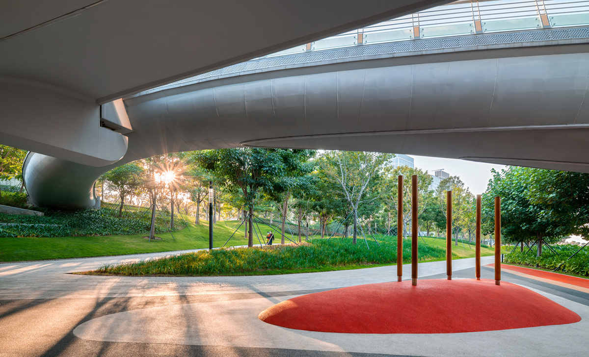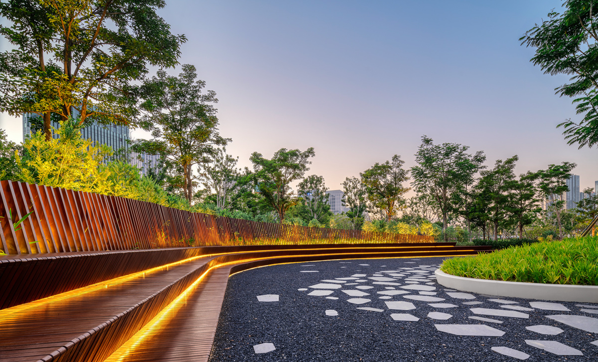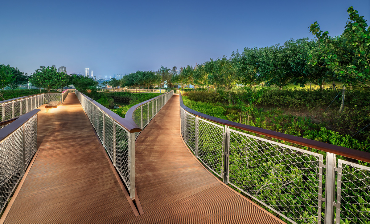 被譽(yù)為前?!熬G芯”的桂灣公園,是前海第一個(gè)永久性、水廊道公園。項(xiàng)目共擁有100 多種、6000 多棵喬木,綠地率72% 以上?;谏鷳B(tài)優(yōu)先原則,項(xiàng)目布局紅樹林海水濕地約6 萬平方米,淡水濕地約2 萬平方米,打造“會(huì)呼吸”的紅樹林岸線景觀。同時(shí),公園呈兩岸一島布局,打造9 大主題景觀——紅樹林迷宮、林冠漫步、運(yùn)動(dòng)草坪攀爬墻、林蔭曲徑、秋千花臺(tái)、露天藝術(shù)劇場(chǎng)、花園濕地、海浪沙灘、海風(fēng)露臺(tái)。