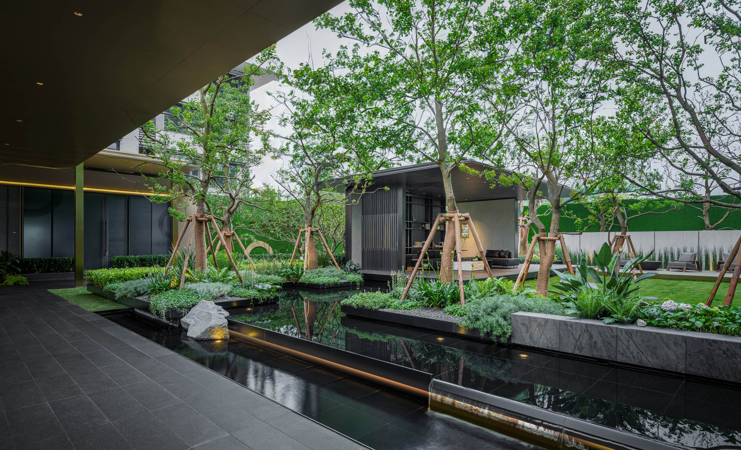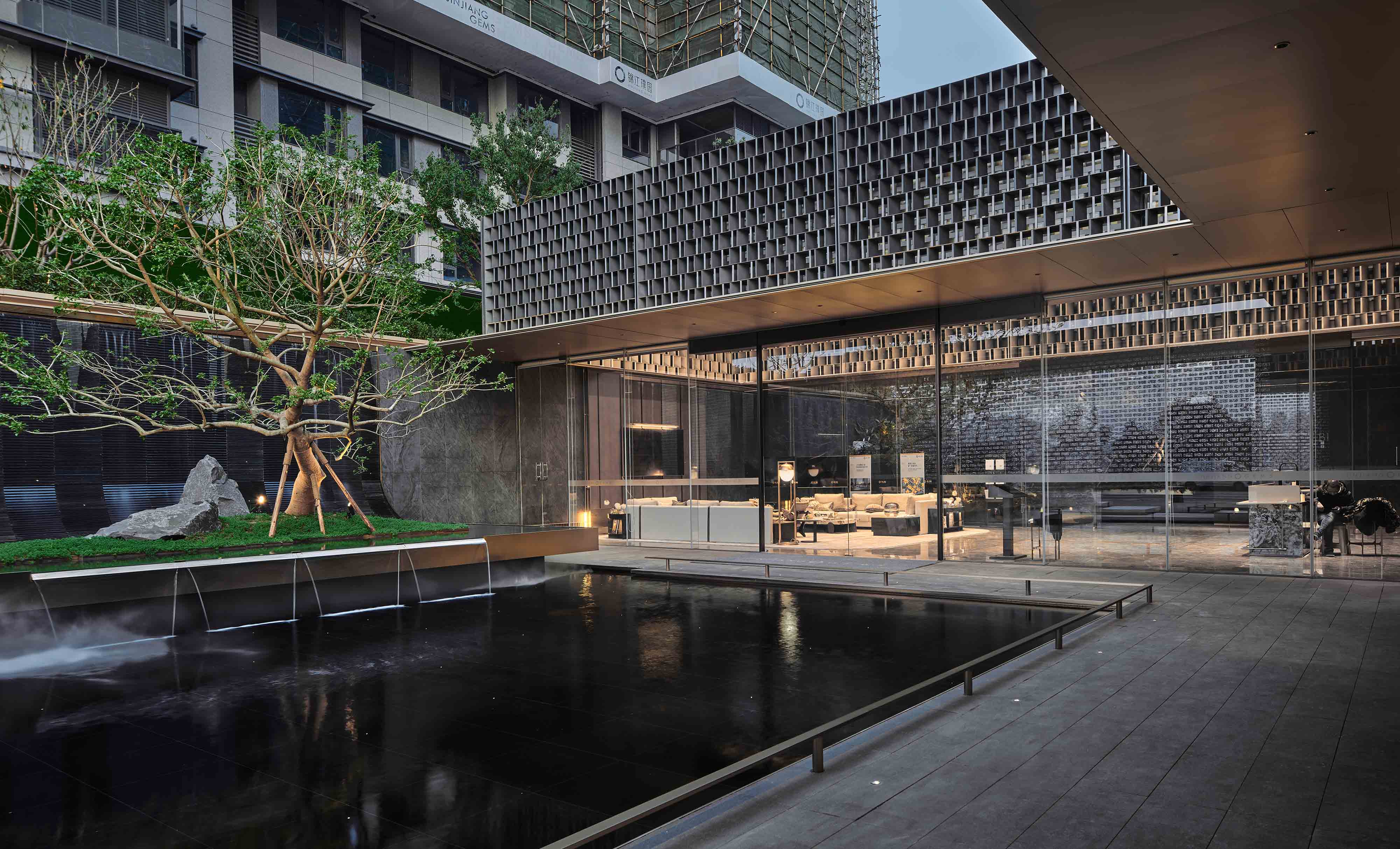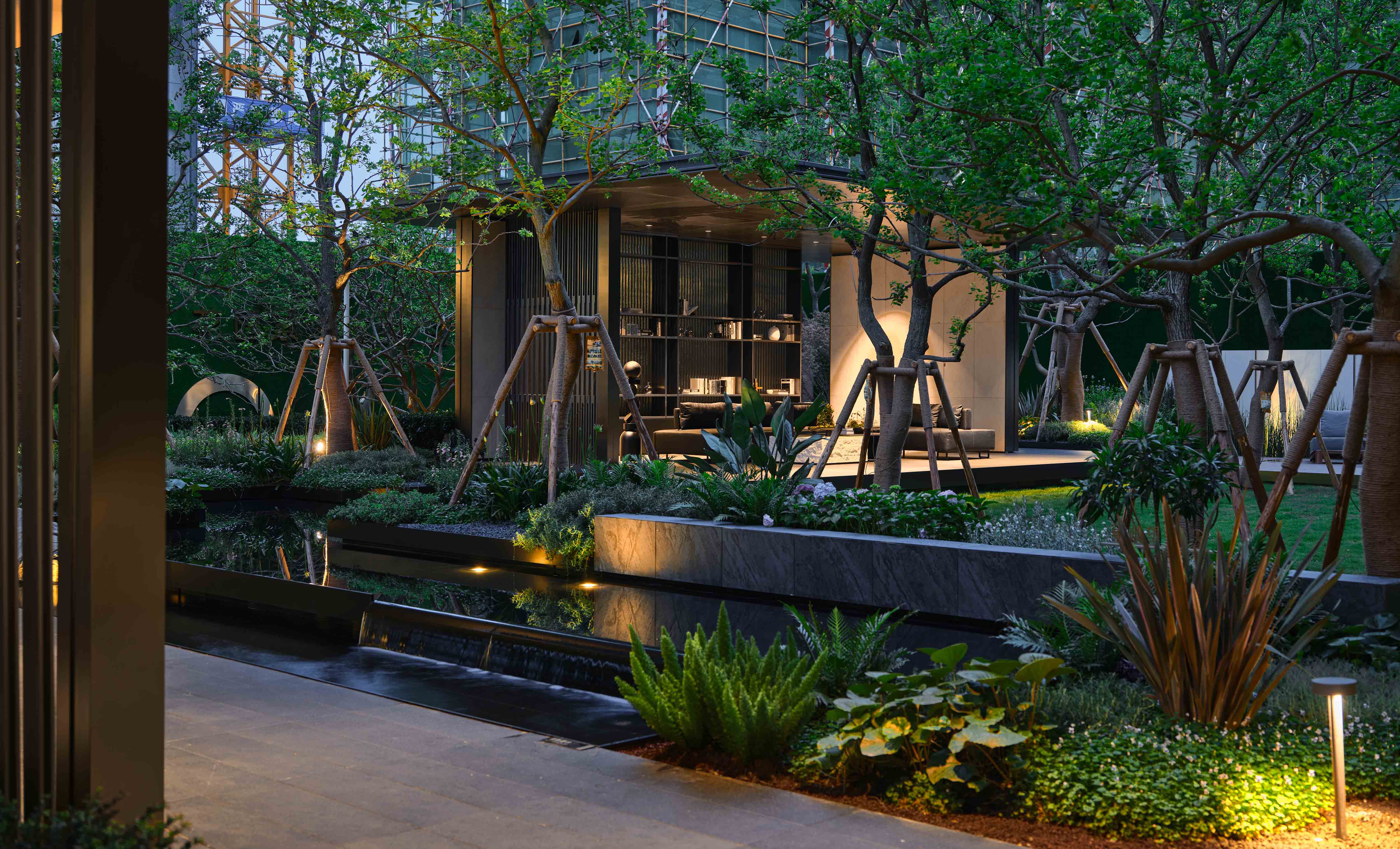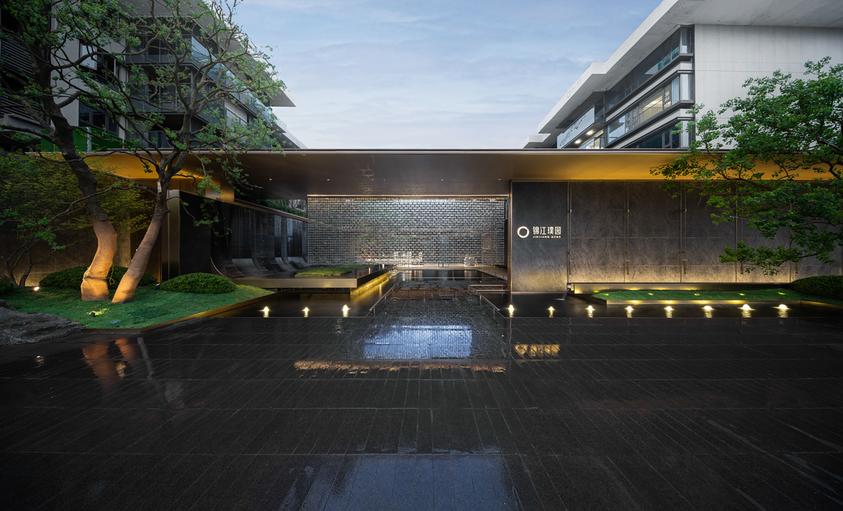 錦江璞園示范區(qū)景觀沿用建筑設(shè)計語言,以“枕水畔境,棲居如畫”為核心理念,以“歸隱—逐水—山棲—會友”四重歸家禮序,將自然容納,通過“尋隱入畫、逐水汀瀑、依山畫居、藏幽望舒、畔畫會友”景觀故事線,從成都傳統(tǒng)的院巷布局入手,將西蜀園林的清雅融入其中,用現(xiàn)代景觀探尋未來新生活。