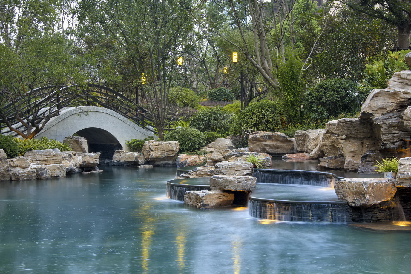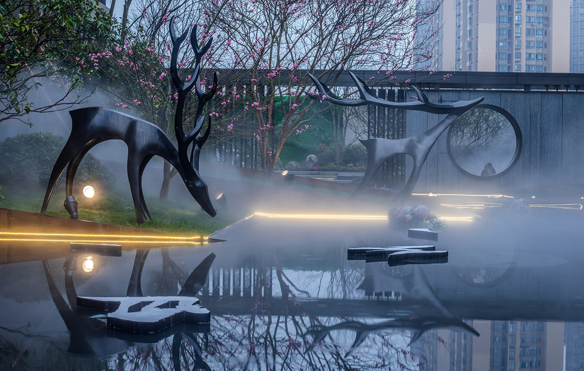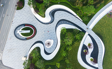 師法自然,致敬土地,從水鄉(xiāng)城中擷取山影、水境、樹聲為景觀靈感, 以“折疊花園”演繹當(dāng)代城中山水自然庭園,以簡約的造景手法續(xù)寫城市自然景觀形態(tài)。
